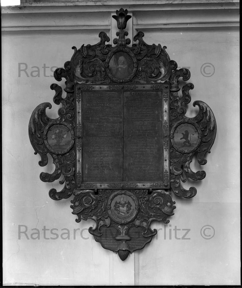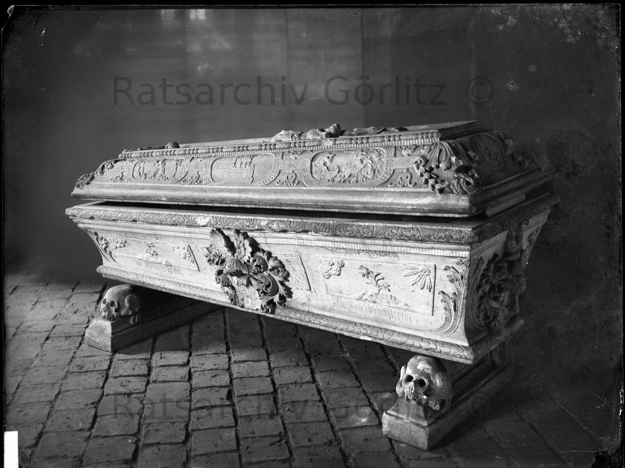 Steinsarg von Nostitz in Peterskirche, jetzt Gedenkhalle Rück- und rechte Seite, Kirche