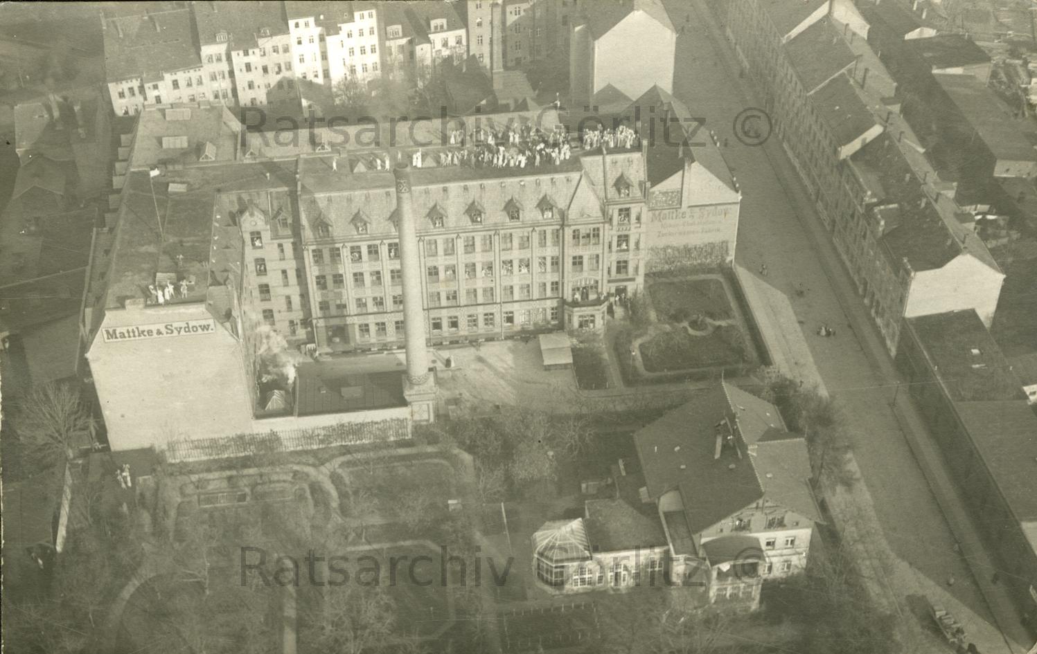 Luftbild Gesamtansicht, Belegschaft auf dem Dach, Betriebschronik