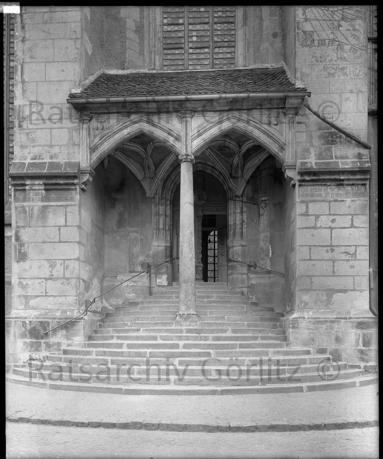 Peterskirche, steiler Treppenaufgang zur Südhalle um 1900, Teil von Sonnenuhr, Kirche