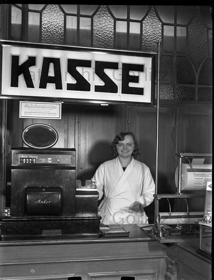 Kasse im Optikerladen Otto Immisch mit Verkäuferin, Geschäft