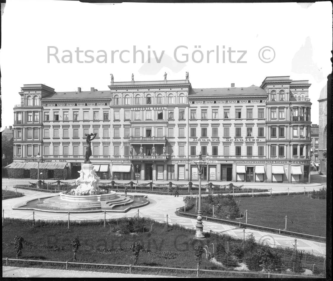 Postplatz mit Brunnen Muschelminna und Hotel Victoria, Wiener Café und Geschäftshaus Eduard Schultze, Brunnen